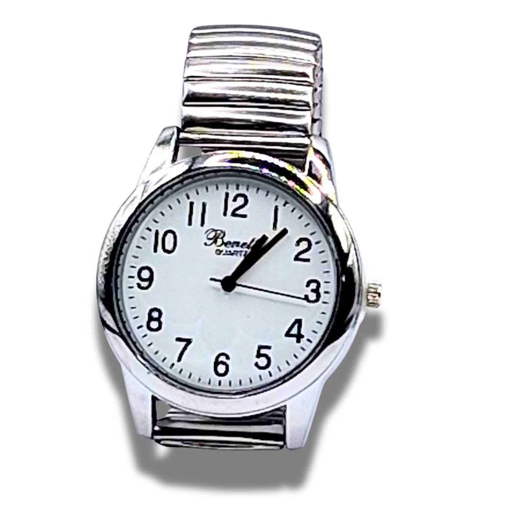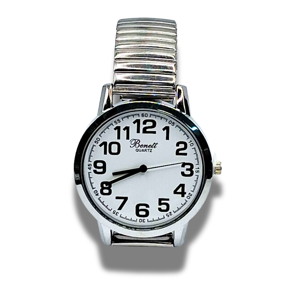 Ceas Quartz cu Cadran Alb și Cifre Mari – Brățară Metalică Elastică, Ușor de Citit, Unisex